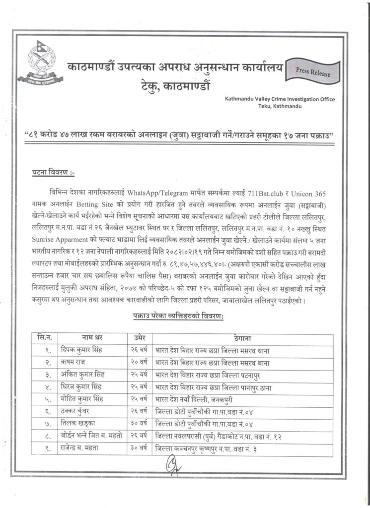८१ करोडकाे अनलाइन जुवा, १७ जना पक्राउ, लमहीका राउत पनि गिरफ्तार
