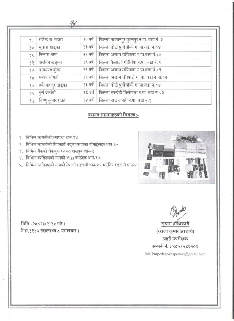 प्रहरीले उनीहरूको साथबाट ल्यापटप १४ थान, मोबाइल ६० थान, विभिन्न बैंकको चेकबुक र वचत पासबुक ९ थान, विभिन्न व्यक्तिहरूको नामको भिसा कार्ड १५ थान, नेपाली राहदानी ४ थान र भारतीय राहदानी ४ थान समेत बरामद गरेको छ ।