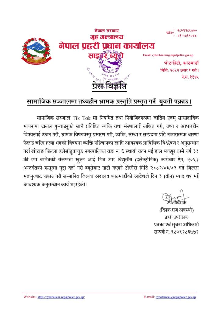 काठमाडौं । सामाजिक सञ्जाल टिकटकबाट उत्तेजक र साम्प्रदायिक सद्भाव भडकाउने गतिविधि गरेको अभियोगमा नेपाल प्रहरीको साइबर व्यूरो, भोटाहिटीले ३१ वर्षीया रमा बस्नेतलाई पक्राउ गरेको छ ।