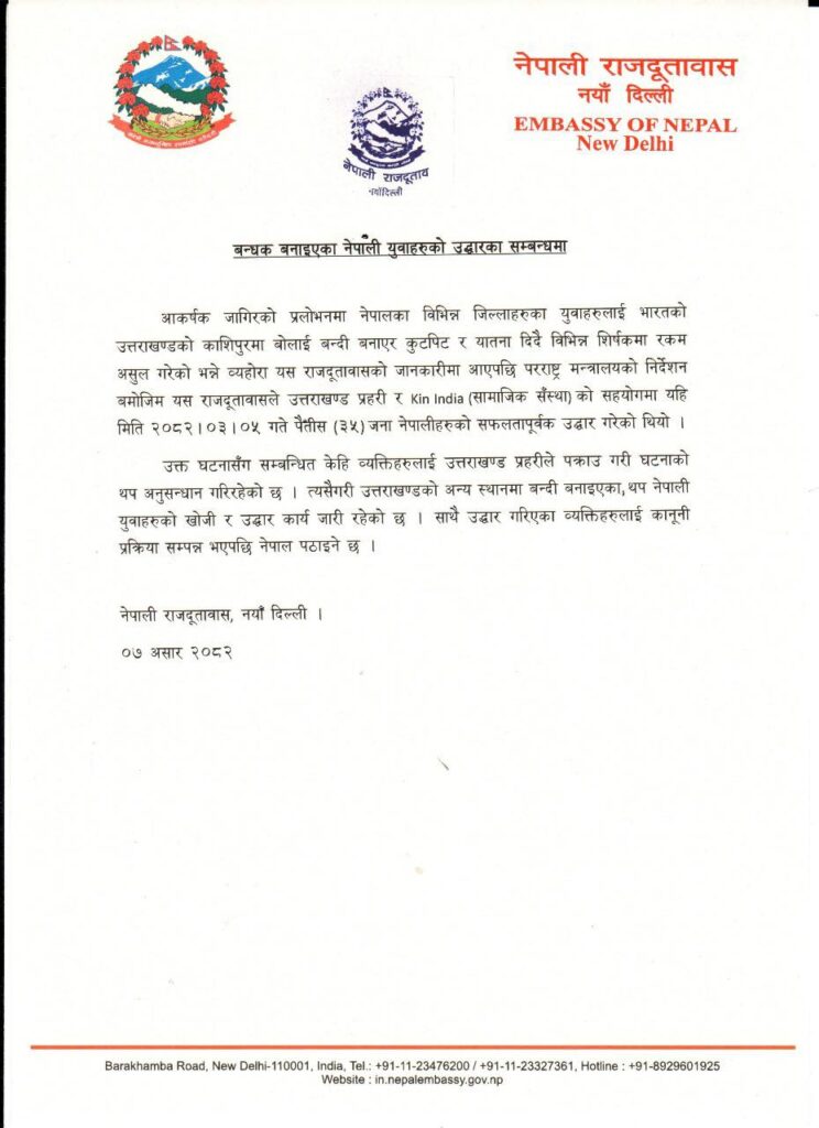 ‘आकर्षक जागिरको प्रलोभनमा नेपालका विभिन्न जिल्लाहरूका युवाहरूलाई भारतको उत्तराखण्डको काशिपुरमा बोलाइ बन्दी बनाएर कुटपिट र यातना दिँदै विभिन्न शीर्षकमा रकम असुल गरेको भन्ने व्यहोरा यस राजदूतावासको जानकारीमा आएपछि परराष्ट्र मन्त्रालयको निर्देशन बमोजिम यस राजदूतावासले उत्तराखण्ड प्रहरी र किन ईण्डिया नामक सामाजिक संस्थाको सहयोगमा यहि मिति २०८२ साउन ५ गते ३५ जना नेपालीहरूको सफलतापूर्वक उद्धार गरेका थियो,’ विज्ञप्तिमा भनिएको छ ।