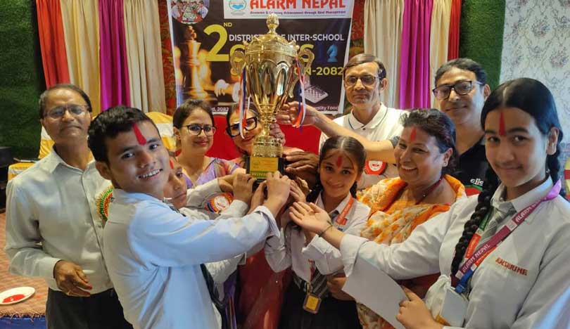 अलार्म नेपालले आफ्नो वार्षिक क्यालेण्डरमा समाविष्ट गरेको जिल्ला व्यापी अन्तरस्कुल दोस्रो अलार्म नेपाल चेस प्रतियोगिताका विजेता इनस्राइन नेशनल इङ्लिस सेकेन्डरी स्कूललाई एक समारोहबीच आकर्षक च्याम्पियन ट्रफी प्रदान गरेका छन् ।