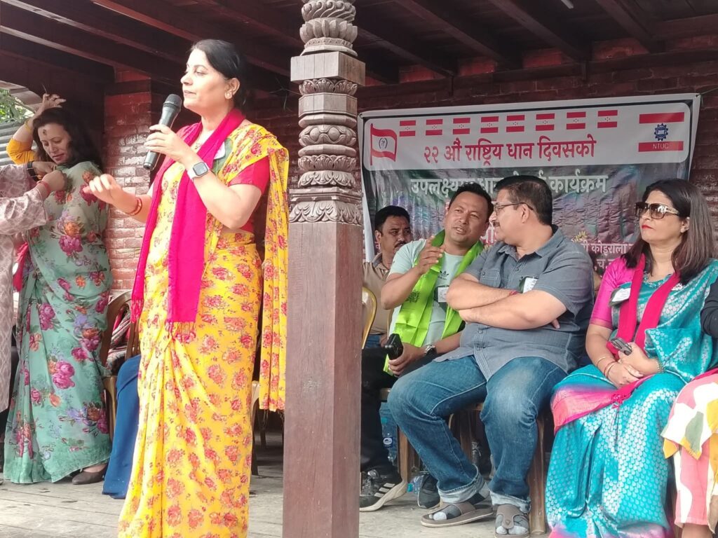 काठमाडौंको चन्द्रागिरी नगरपालिका वडा नं.९ मच्छेगाउँमा आयोजित राष्ट्रिय धान दिवसको कार्यक्रममा सहभागी भएका हुन् । कांग्रेस नेताहरू रोपाइमा सहभागी भएर राष्ट्रिय धान दिवसको महत्व उजागर गरेका छन् । उनीहरूले नेपाल कृषिमा निर्भर रहेको भन्दै उत्पादनमा केन्द्रित रहेर कृषिलाई आवश्यक पर्ने सहयोग गर्न सरकारसँग आग्रह गरेका छन् ।