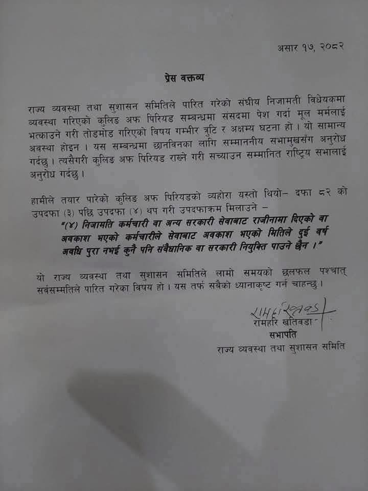 मंगलबार प्रेस वक्तव्य जारी गरेर सभापति खतिवडाले भने, ‘राज्य व्यवस्था तथा सुशासन समितिले पारित गरेको संघीय निजामती विधेयकमा व्यवस्था गरिएको कुलिङ अफ पिरियड सम्बन्धमा संसदमा पेश गर्दा मूल मर्मलाई भत्काउने गरि तोडमोड गरिएको विषय गम्भीर त्रुटि र अक्षम्य घटना हो ।’