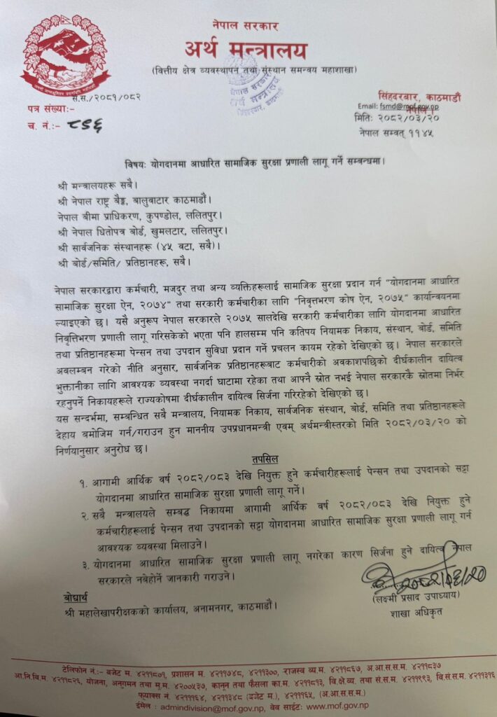 अर्थले सबै मन्त्रालय, नेपाल राष्ट्र बैङ्क, नेपाल बीमा प्राधिकरण, नेपाल धितोपत्र बोर्ड, सबै सार्वजनिक संस्थान, बोर्ड समिति, प्रतिष्ठानलाई पत्राचार गरेर योगदानमा आधारित सामाजिक सुरक्षा प्रणाली लागू गर्न भनेको छ ।