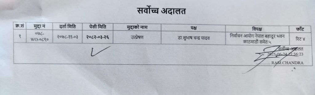 डा.यादवले चौधरीविरुद्ध सर्वोच्चमा २०७८ फाल्गुन ३ गते रिट दायर गरेका हुन् । रिट मुद्दामा सर्वोच्च अदालतले २० वटाभन्दा बढी पेसी तोकिसकेकोले असार २३ गते सुनुवाइ गरी फैसला गर्ने सम्भावना रहेको डा.यादव र उनका कानून व्यवसायीहरूले बताएका छन् ।