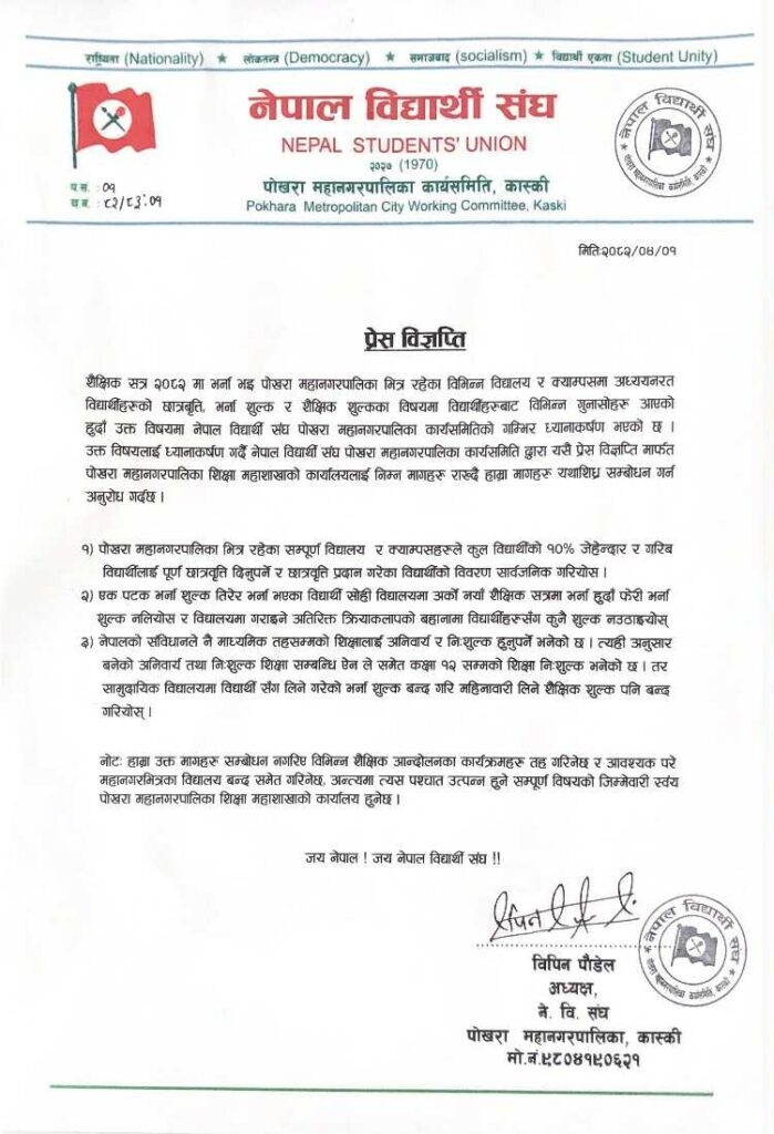 बिहीबार अध्यक्ष पौडेलले प्रेस विज्ञप्ति जारी गरेर भने, ‘शैक्षिक सत्र २०८२ मा भर्ना भइ पोखरा महानगरपालिकाभित्र रहेका विभिन्न विद्यालय र क्याम्पसमा अध्ययनरत विद्यार्थीको छात्रबृत्ति, भर्ना शुल्क र शैक्षिक शुल्कका विषयमा विद्यार्थीबाट विभिन्न गुनासोहरू आएको हुँदा उक्त विषयमा नेपाल विद्यार्थी संघ पोखरा महानगरपालिका कार्यसमितिको गम्भीर ध्यानाकर्षण भएको छ ।’