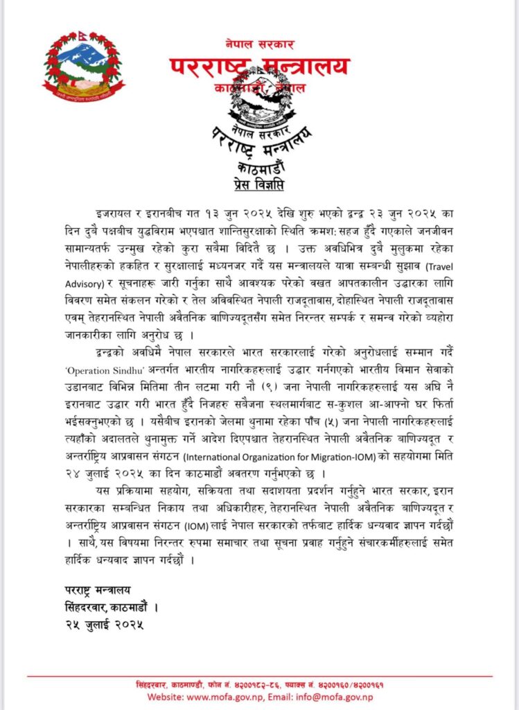 ‘इरानको जेलमा थुनामा रहेका ५ जना नेपाली नागरिकहरूलाई त्यहाँको अदालतले थुनामुक्त गर्ने आदेश दिएपश्चात तेहरानस्थित नेपाली अवैतानिक बाणिज्यदूत र अन्तर्राष्ट्रिय आप्रवासन संगठनको सहयोगमा २४ जुलाई २०२५ का दिन काठमाडौं अवतरण गर्नुभएको छ,’ शुक्रबार परराष्ट्र मन्त्रालयद्वारा जारी विज्ञप्तिमा भनिएको छ ।