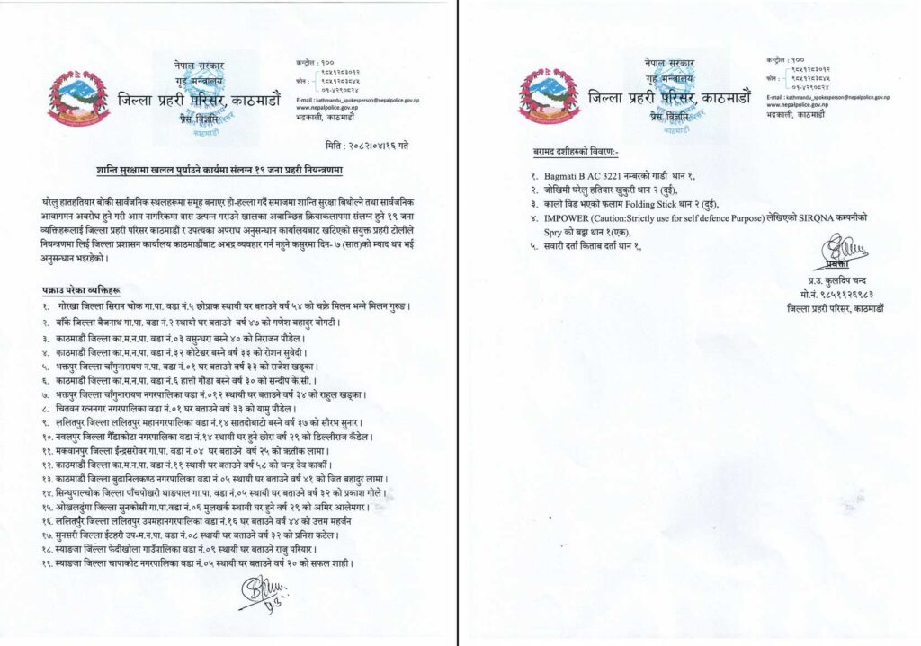 जिल्ला प्रहरी परिसर, काठमाडौं र काठमाडौं उपत्यका अराध अनुसन्धान कार्यालय, टेकुको संयुक्त टोलीले १९ जनालाई बिहीबार राति नियन्त्रणमा लिएको एसपी चन्दले बताए ।