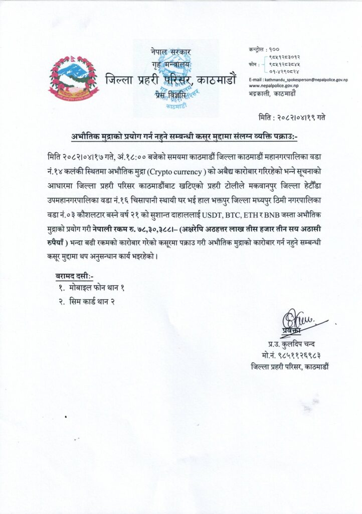 काठमाडौं महानगरपालिका–१४ कलंकीमा अभौतिक मुद्राको कारोबार भइरहेको भन्ने सूचनाको आधारमा जिल्ला प्रहरी परिसर काठमाडौंबाट खटिएको प्रहरीले उक्त कार्यमा संलग्न उनलाई पक्राउ गरेको हो ।