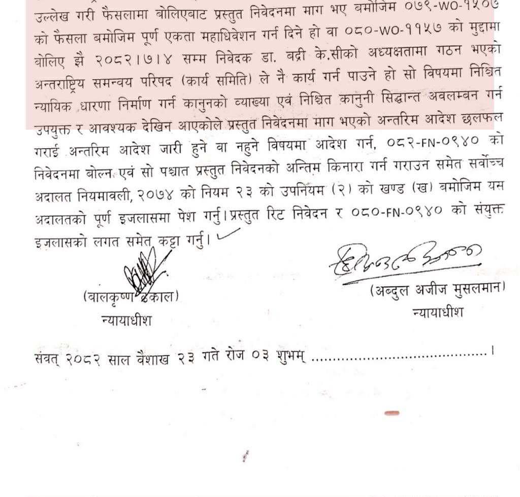 उक्त आदेशमा, बद्री केसी अध्यक्ष रहेको अन्तर्राष्ट्रिय समन्वय परिषदले कात्तिक ४ सम्म काम गर्ने वा नगर्ने भन्ने विषयमा निश्चित कानूनी व्याख्या गर्न पूर्ण इजलाशमा मुद्दा पठाइएको स्पष्ट उल्लेख छ ।