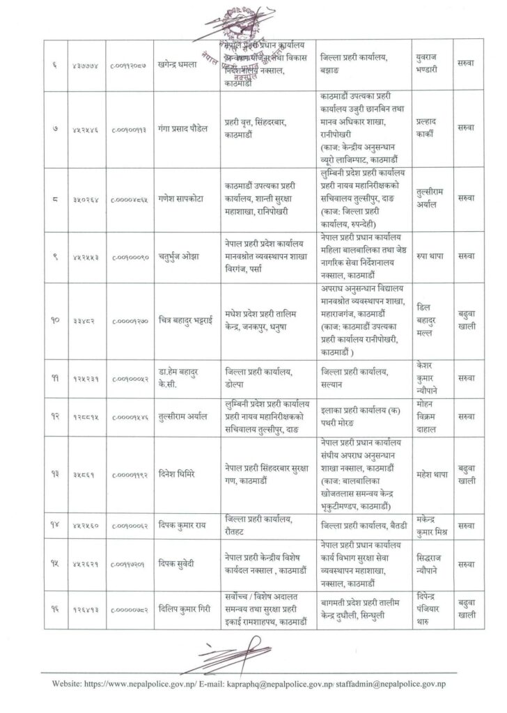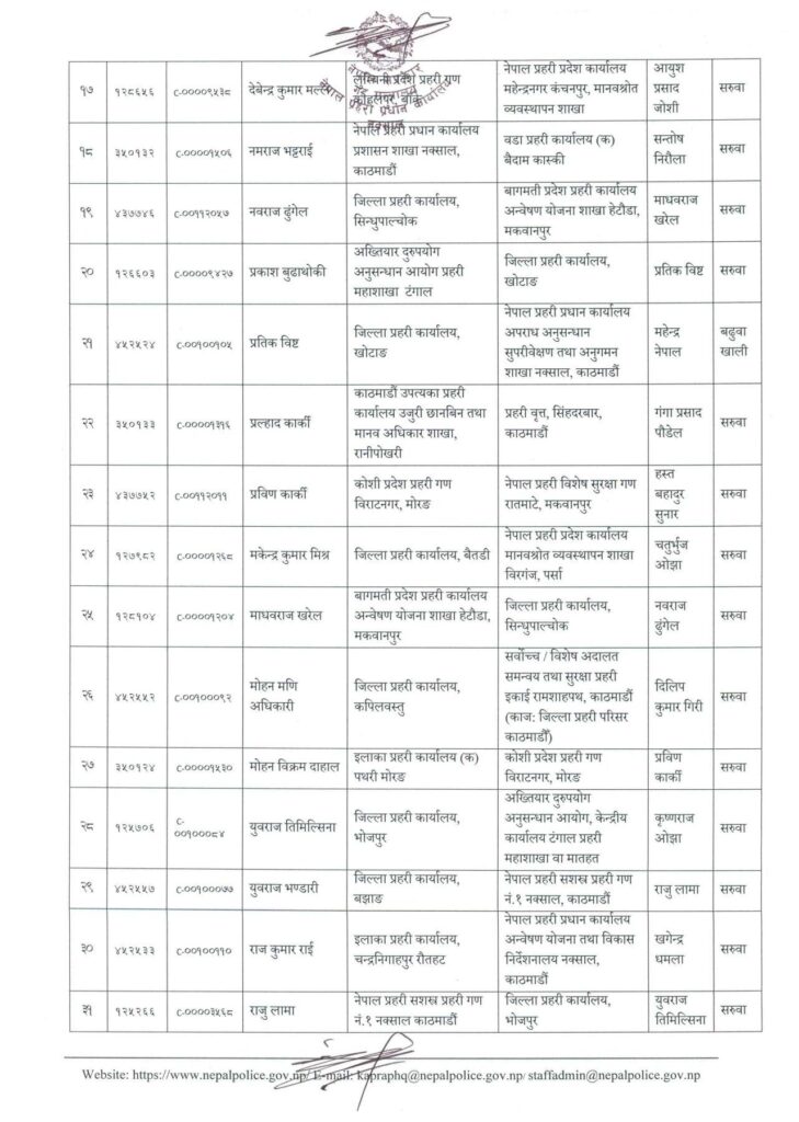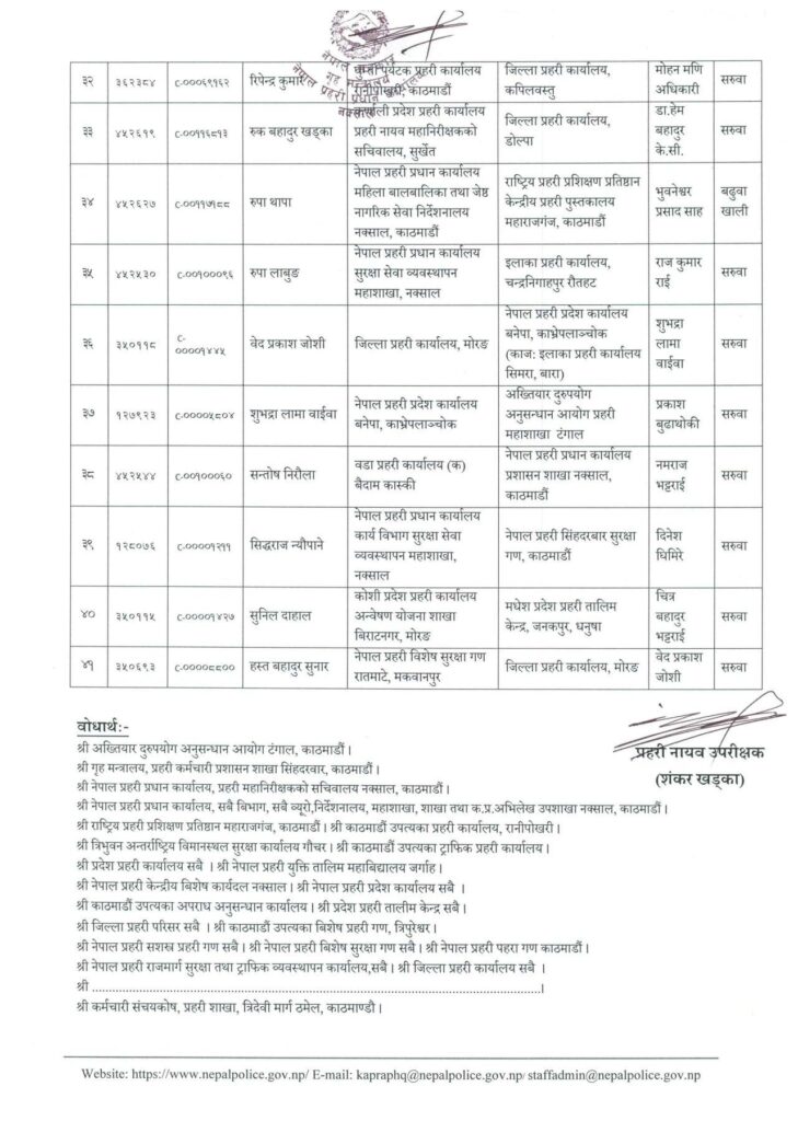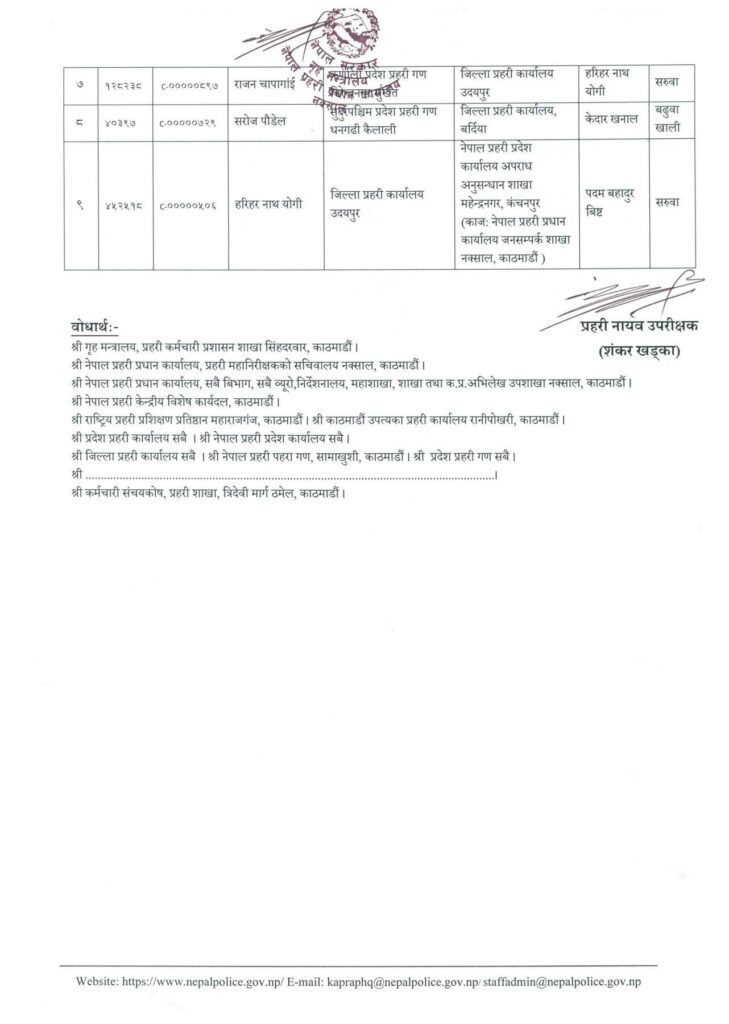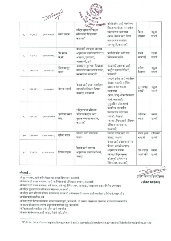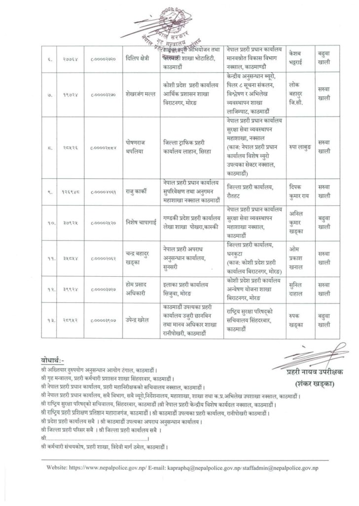 जिल्ला प्रहरी कार्यालय तनहुँमा टेकबहादुर कार्की क्षेत्री, धादिङमा भेषराज रिजाल, उदयपुरमा राजन चापागाईं र बर्दियामा सरोज पौडेलको सरुवा भएको छ ।