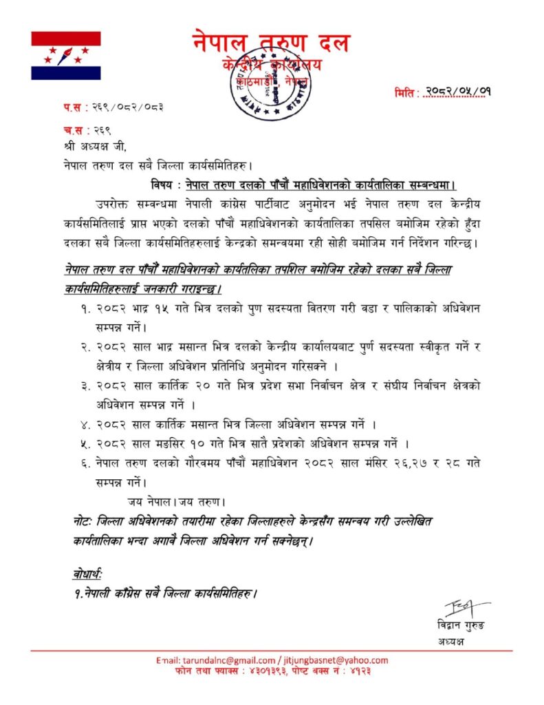 तरुण दलको पाँचौँ महाधिवेशन मंसिर २६ देखि २८ सम्म हुने, कार्यतालिका सार्वजनिक