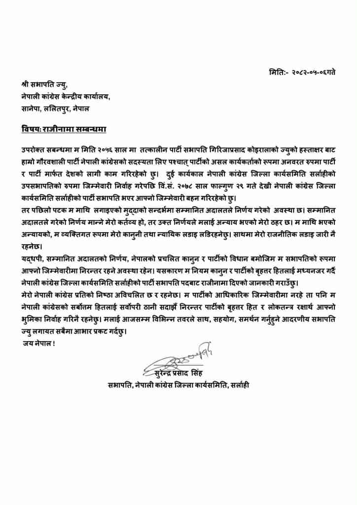 ‘सम्मानित अदालतको निर्णय, नेपालको प्रचलित कानुन र पार्टीको विधान बमोजिम म सभापतिको रूपमा आफ्नो जिम्मेवारीमा निरन्तर रहने अवस्था रहेन,’ सिंहले भने, ‘यसकारण म नियम कानून र पार्टीको बृहत्तर हितलाई मध्यनजर गर्दै नेपाली कांग्रेस जिल्ला कार्यसमिति सर्लाहीको पार्टी सभापति पदबाट राजीनामा दिएको जानकारी गराउँछु ।’