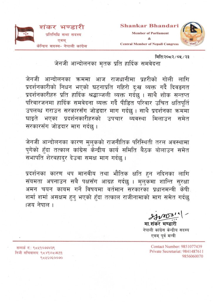सोमबार प्रेस विज्ञप्ति जारी गरेर भण्डारीले घाइतेहरूको उपचारका व्यवस्था मिलाउन सरकारसँग माग गरेका छन् । उनले जेनजी आन्दोलनका कारण मुलुकको राजनीतिक परिस्थिति तरल अवस्थामा पुगेको भन्दै तत्काल केन्द्रीय कार्यसमितिको बैठक बोलाउन सभापति शेरबहादुर देउवासँग माग गरेका छन् ।