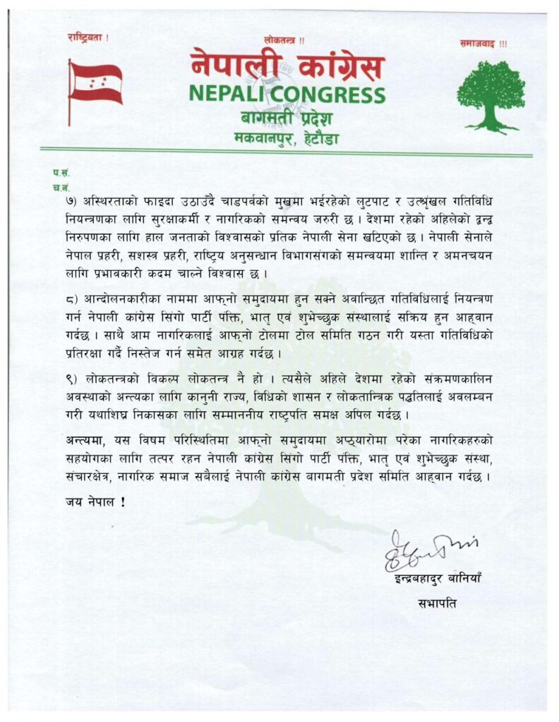 ‘आन्दोलनकारीका नाममा आफ्नो समुदायमा हुन सक्ने अवान्छित गतिविधिलाई नियन्त्रण गर्न नेपाली कांग्रेस सिंगो पार्टी पंक्ति, भ्रातृ एवम् शुभेच्छुक संस्थालाई सक्रिय हुन आह्वान गर्दछ,’ विज्ञप्तिमा भनिएको छ, ‘आम नागरिकलाई आफ्नो टोलमा टोल समिति गठन गरी यस्ता गतिविधिको प्रतिरक्षा गर्दै निस्तेज गर्न समेत आग्रह गर्दछ ।’