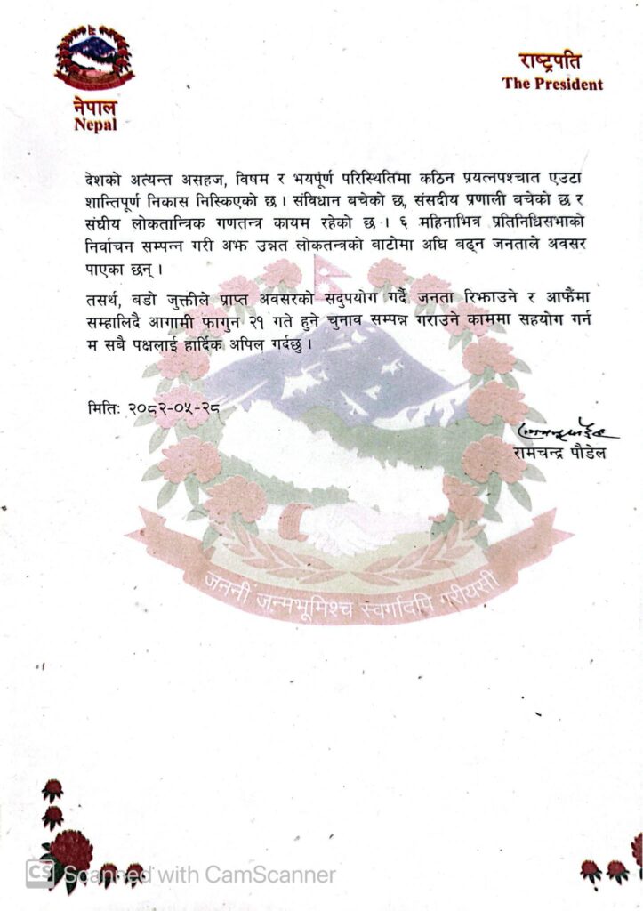 फागुन २१ गते हुने चुनाव सम्पन्न गराउने काममा सहयोग गर्न अपील गर्छु : राष्ट्रपति