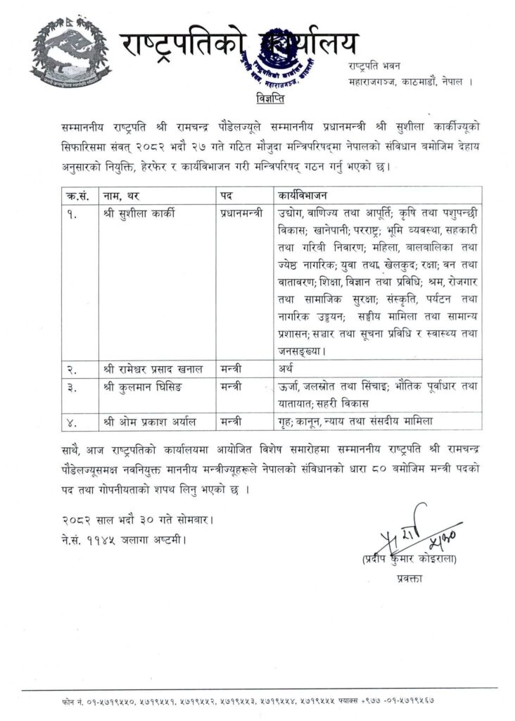 सोमबार शीतलनिवासमा आयोजित कार्यक्रममा राष्ट्रपति पौडेलसमक्ष नवनियुक्त अर्थमन्त्री रामेश्वरप्रसाद खनाल, ऊर्जा, जलस्रोत तथा सिँचाइ, भौतिक पूर्वाधार र सहरी विकासमन्त्री कुलमान घिसिङ र गृह तथा कानूनमन्त्री ओमप्रकाश अर्याल शपथ लिएका हुन् ।