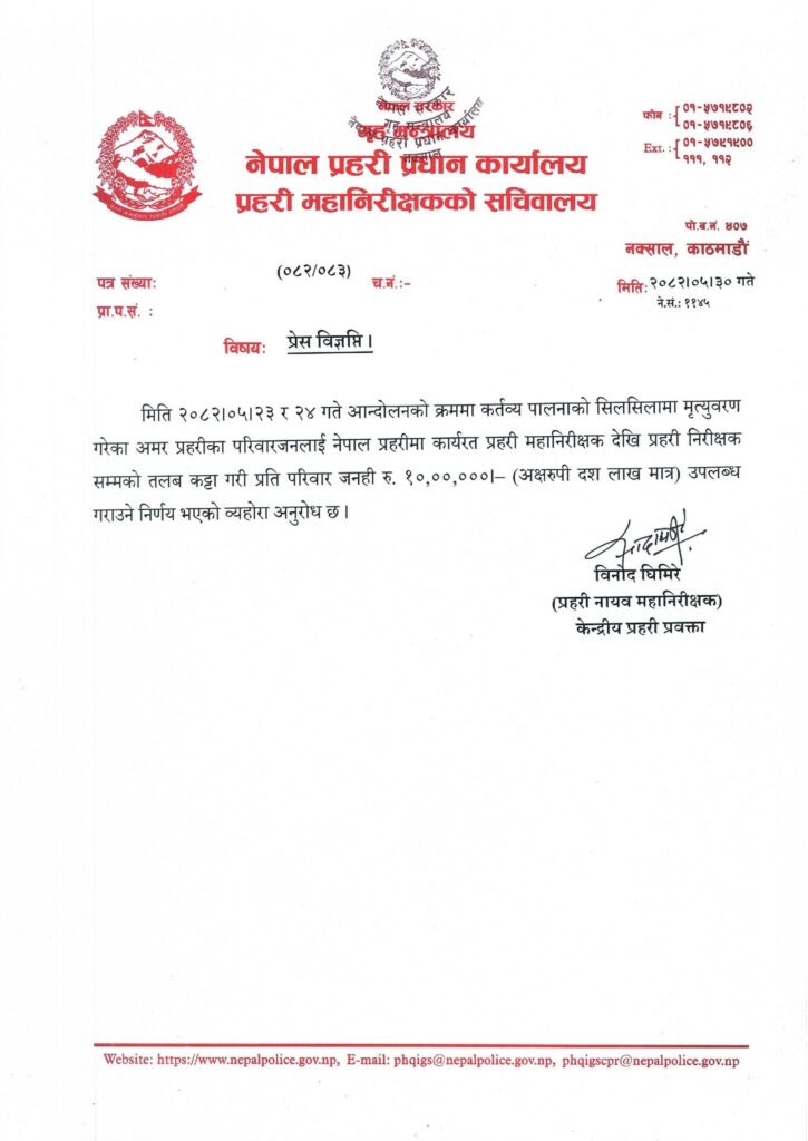 विज्ञप्तिमा भनिएको छ, ‘मिति २०८२ भदौ २३ र २४ गते आन्दोलनका क्रममा कर्तव्य पालनाको सिलसिलामा मृत्युवरण गरेका अमर प्रहरीका परिवारजनलाई नेपाल प्रहरीमा कार्यरत प्रहरी महानिरीक्षकदेखि प्रहरी निरीक्षक (ईन्स्पेक्टर)सम्मको तलब कट्टा गरी प्रतिपरिवार जनही रु. १० लाख उपलबध गराउने निर्णय भएको व्यहोरा अनुरोध छ ।’