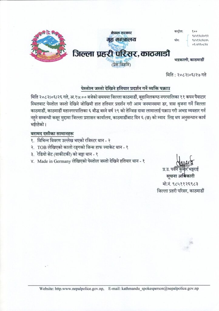 बिजुली बजार पुलमा अर्का एकजना युवकले दिएको पेस्तोल दावाले कम्मरमा भिरेर बाइक चलाउँदै हिँडेको भिडियो सामाजिक सञ्जालमा देखिएको छ । भिडियोबारे प्रहरीले अनुसन्धान गरिरहेको छ ।