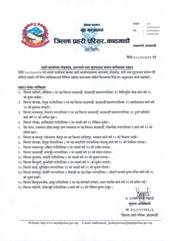 भदौ २४ गतेको अपराधमा संलग्न भारतीयसहित थप १५ जना पक्राउ