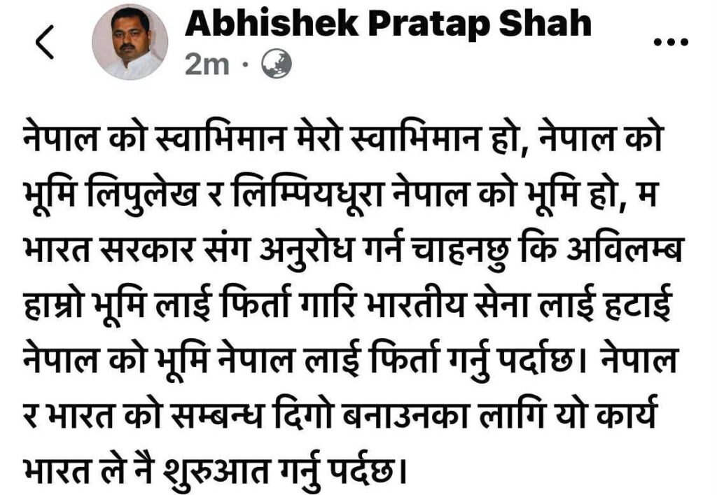 बिहीबार कांग्रेस नेता शाहले सामाजिक सञ्जाल फेसबुकमा सन्देश लेख्दै भने, ‘नेपालको स्वाभिमान मेरो स्वाभिमान हो, नेपालको भूमि लिपुलेख र लिम्पियधूरा नेपालको भूमि हो ।’