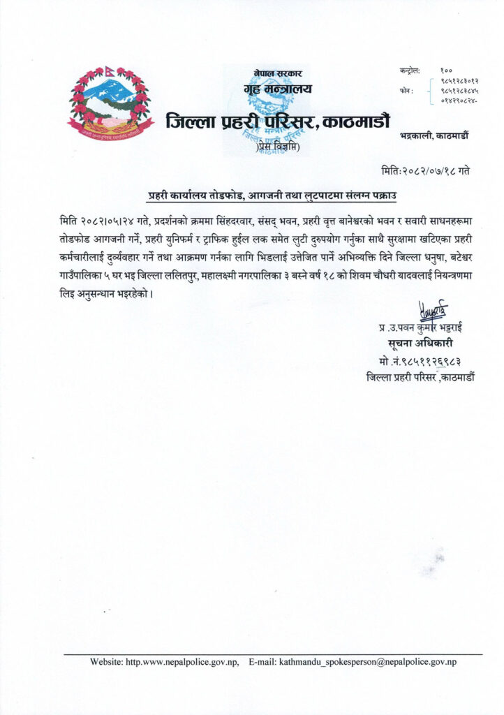 सिंहदरबार, संसद् भवन र प्रहरी वृत्त जलाउन संलग्न शिवम् चौधरीलाई पक्राउ