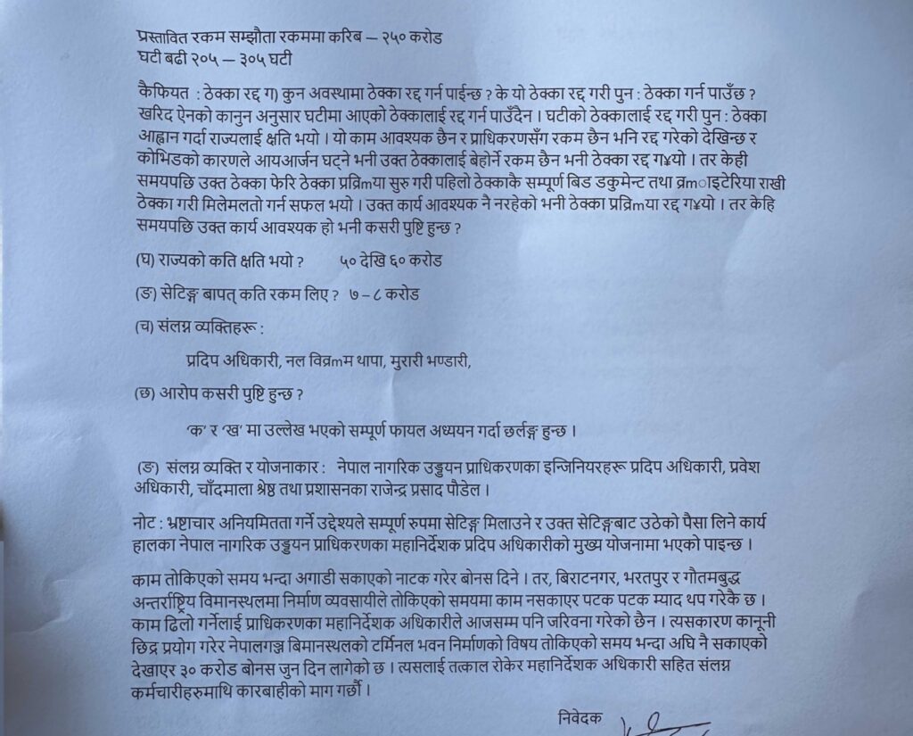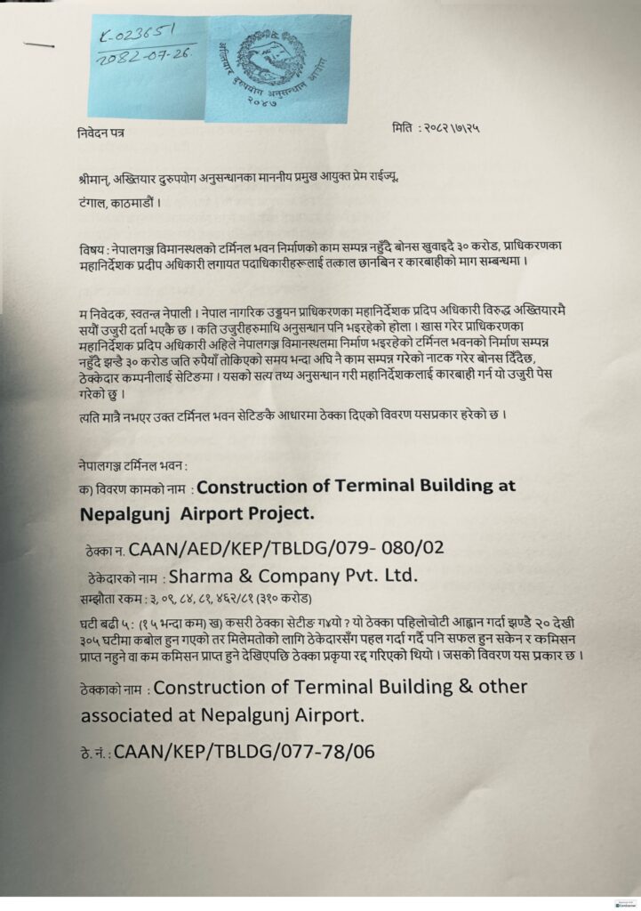 उजुरीमा नेपालगञ्ज विमानस्थलको टर्मिनल भवन सेटिङ कै आधारमा ठेक्का दिएको विवरण र जानकारीका दस्तावेजहरू पनि अख्तियारमा बुझिएको उल्लेख छ ।