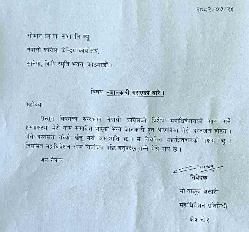 कार्तिक २३ गते अंसारीले कार्यबाहक सभापति खड्कालाई दिएको निवेदनमा भनिएको छ, ‘प्रस्तुत विषयको सन्दर्भमा नेपाली कांग्रेसको विशेष महाधिवेशनको माग गर्ने हस्ताक्षरमा मेरो नाम समावेश भएको भन्ने जानकारी हुन आएकोमा मेरो दस्तखत होइन । मैले दस्तखत गरेको छैन, मेरो असहमति छ । म नियमित महाधिवेशनको पक्षमा छु । नियमित महाधिवेशन आम निर्वाचनपछि गर्नुपर्दछ भन्ने मेरो राय छ ।’