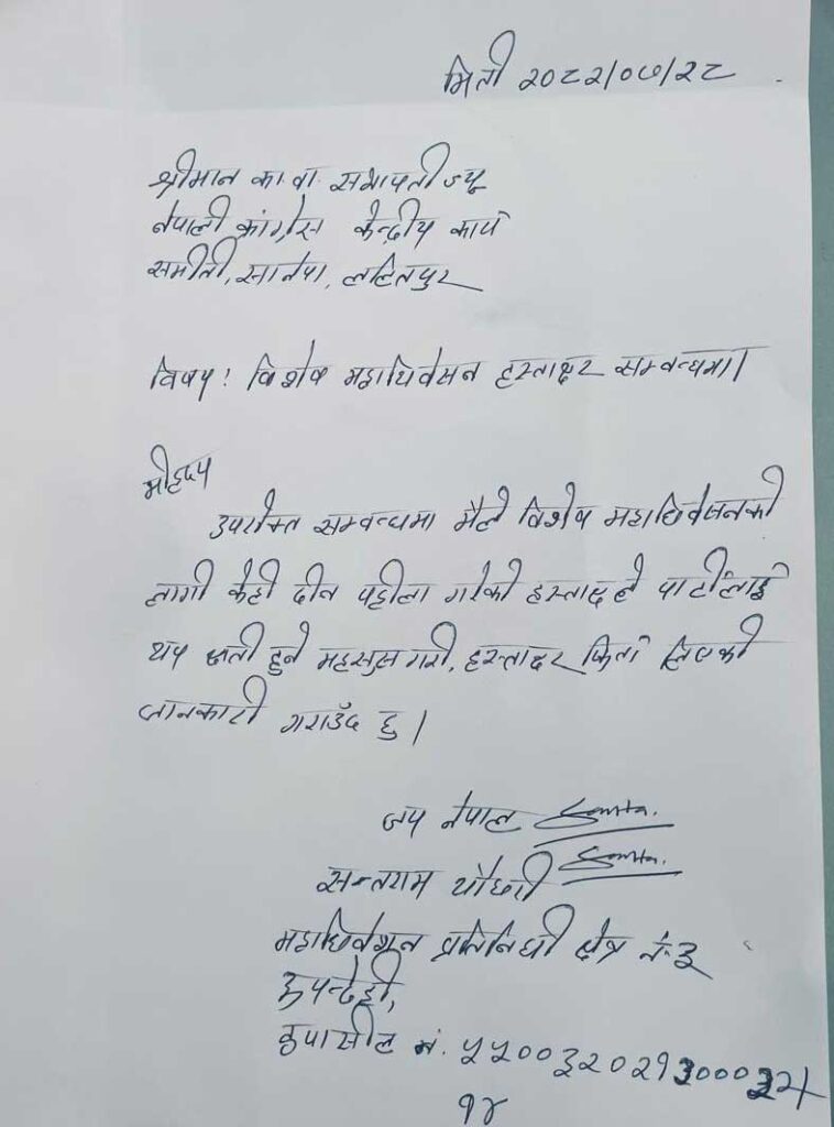 काठमाडौं । नेपाली कांग्रेस, रुपन्देहीका स्थानीय नेता एवम् महाधिवेशन प्रतिनिधि सन्तराम चौधरीले विशेष महाधिवेशनका लागि गरेको हस्ताक्षर फिर्ता लिएका छन् ।