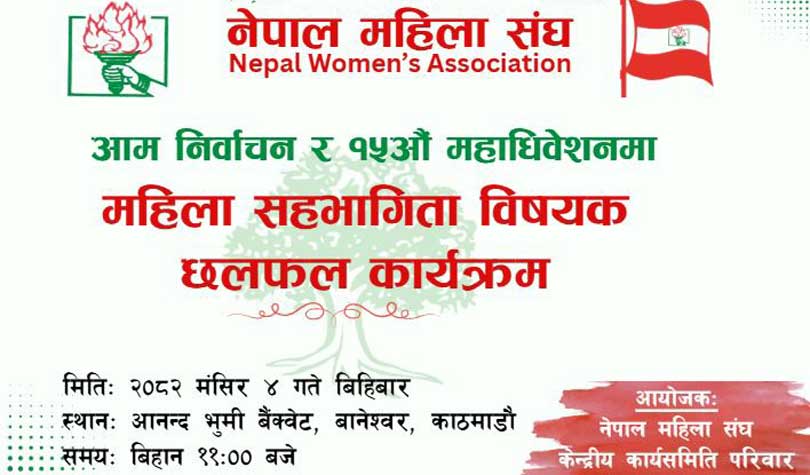 काठमाडौं । नेपाल महिला संघले आमनिर्वाचन र १५औँ महाधिवेशनका विषयमा छलफल गर्न भेला बोलाएको छ ।