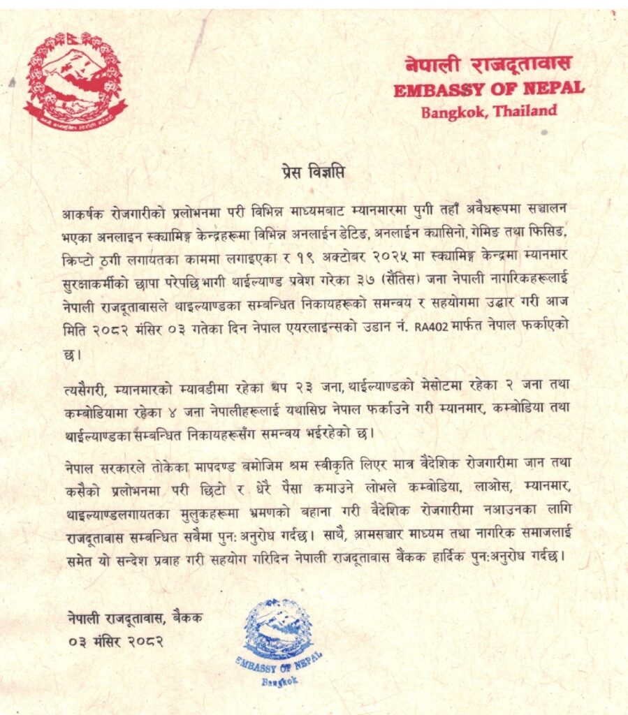 म्यानमारको म्यावडीमा रहेका थप २३ जना, थाईल्याण्डको मेसोटमा रहेका २ जना तथा कम्बोडियामा रहेका ४ जना नेपालीहरूलाई यथाशीघ्र नेपाल फर्काउने गरी म्यानमार, कम्बोडिया तथा थाईल्याण्डका सम्बन्धित निकायहरूसँग समन्वय भइरहेको छ ।