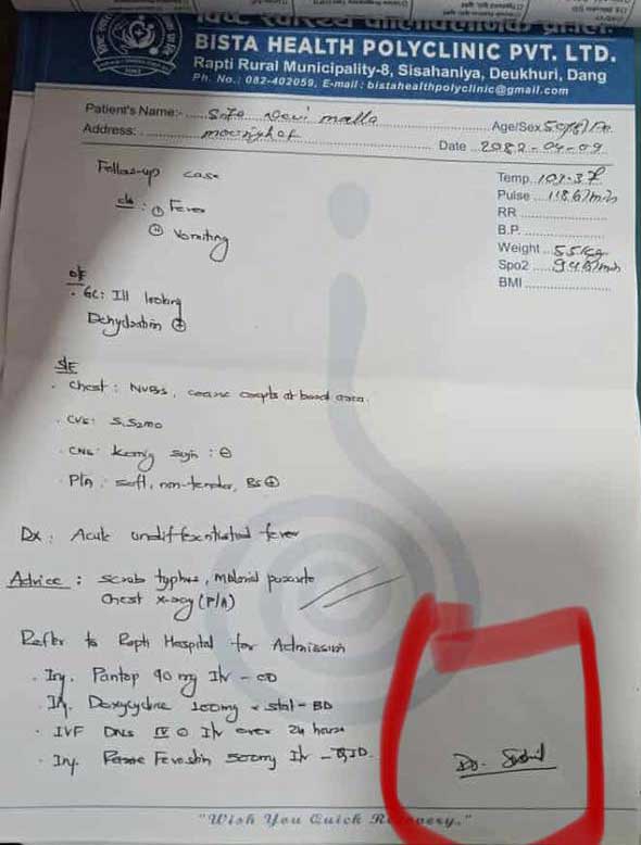 सामाजिक सञ्जालमा सार्वजनिक भएका औषधि र जाँचको सिफारिस पर्चाले गाउँपालिकाका अध्यक्ष विष्टले सरकारी स्वास्थ्य संस्थाका स्वास्थ्य कर्मचारीहरूलाई आफ्नो क्लिनिकमा काममा लगाएको खुलेको हो । उनले सरकारी स्वास्थ्य संस्थाका एकजना फिजिसियन चिकित्सकलाई आफ्नो क्लिनिकमा लगेर काममा लगाएको पर्चाको तथ्यले देखाएको छ । सरकारी स्वास्थ्य संस्थाको चिकित्सकलाई आफ्नो निजी क्लिनिकमा लगेर काम गराएको विषयमा अध्यक्ष विष्ट र राप्ती गाउँपालिकाले केही प्रतिक्रिया दिएको छैन ।