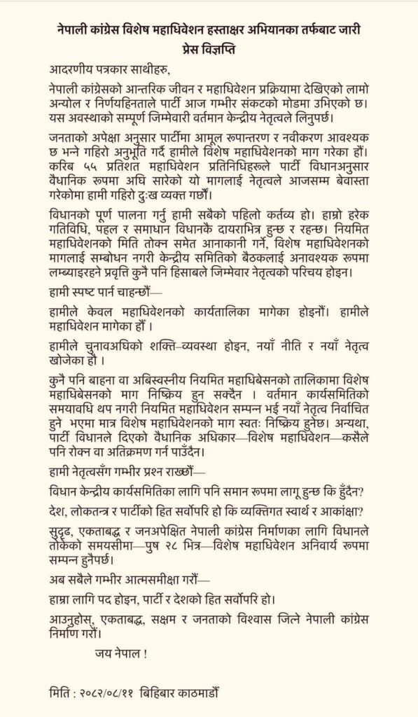 काठमाडौं । नेपाली कांग्रेस विशेष महाधिवेशन हस्ताक्षर अभियानका तर्फबाट भन्दै बतासे प्रेस विज्ञप्ति जारी भएको छ ।
