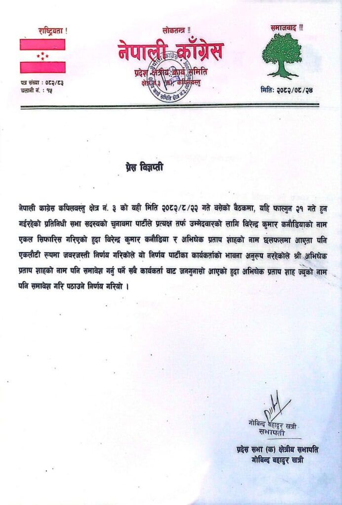 प्रदेश सभापति खत्रीले प्रेस विज्ञप्तिमा भनेका छन्, ‘नेपाली कांग्रेस, कपिलवस्तु क्षेत्र नं. ३ को यही मिति २०८२÷०८÷२२ गते बसेको बैठकमा, यही फाल्गुन २१ गते हुन गइरहेको प्रतिनिधिसभा सदस्यको चुनावमा पार्टीले प्रत्यक्षतर्फ उम्मेदवारको लागि वीरेन्द्रकुमार कनौडियाको नाम एकल सिफारिस गरिएको हुँदा वीरेन्द्रकुमार कनौडिया र अभिषेकप्रताप शाहको नाम छलफलमा आएता पनि एकलौटी रूपमा जवरजस्ती निर्णय गरिकोले यो निर्णय पार्टीका कार्यकर्ताको भावना अनुरूप नरहेकोले श्री अभिषेकप्रताप शाहको नाम पनि समावेश गर्नु पर्ने सबै कार्यकर्ताबाट जनगुनासो आएको हुँदा अभिषेकप्रताप शाह ज्यूको नाम पनि समावेश गरि पठाउने निर्णय गरियो ।’