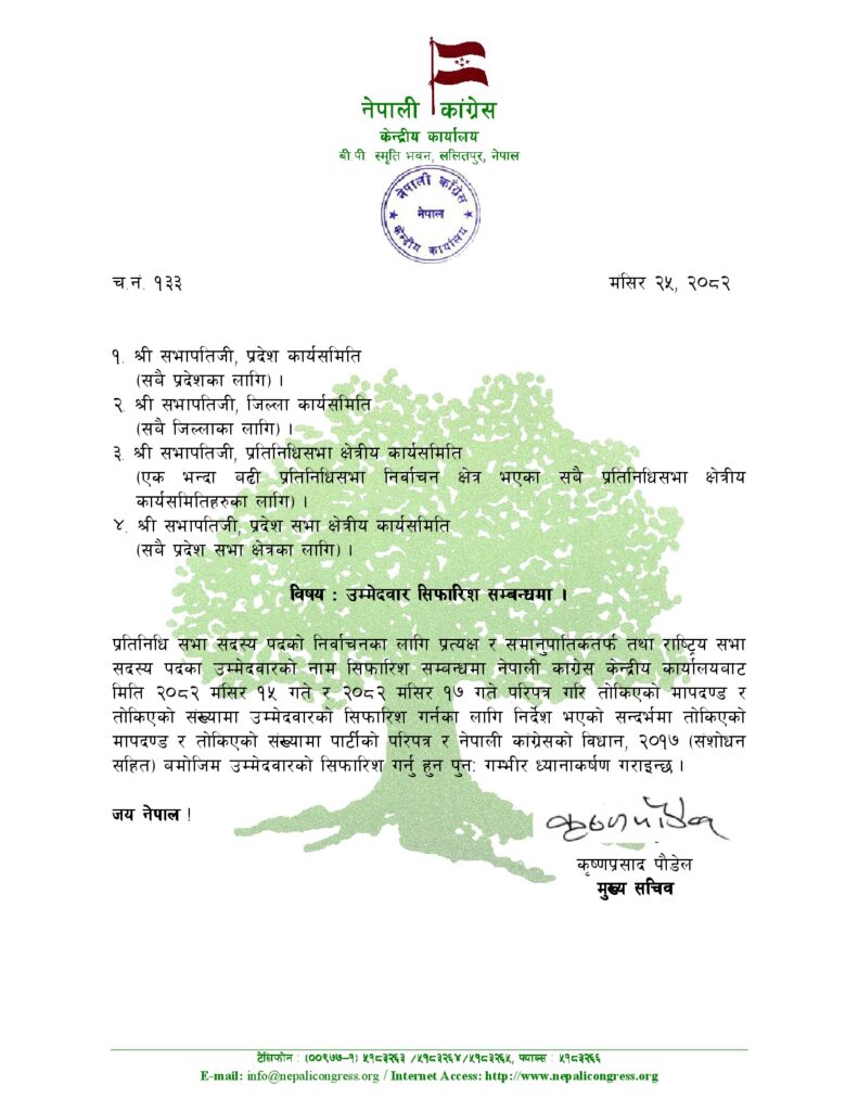 उनले भने, ‘नेपाली कांग्रेसको विधान, २०१७ (संशोधन सहित) बमोजिम उम्मेदवारको सिफारिश गर्नु हुन पुनः गम्भीर ध्यानाकर्षण गराइन्छ ।’