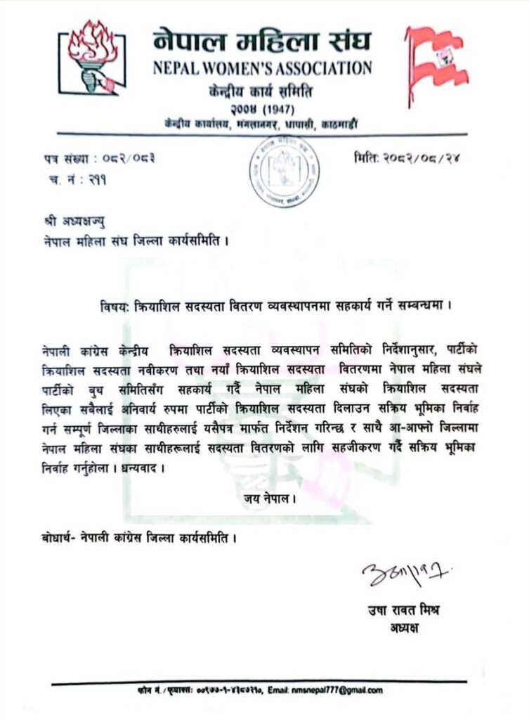 ‘नेपाल महिला संघले पार्टीको बुथ समितिसँग सहकार्य गर्दै नेपाल महिला संघको क्रियाशील सदस्यता लिएका सबैलाई अनिवार्य रुपमा पार्टीको क्रियाशील सदस्यता दिलाउन सक्रिय भूमिका निर्वाह गर्न सम्पूर्ण जिल्लाका साथीहरुलाई यसैपत्र मार्फत निर्देशन गरिन्छ र साथै आ–आपनो जिल्लामा नेपाल महिला संघका साथीहरूलाई सदस्यता वितरणको लागि सहजीकरण गर्दी सक्रिय भूमिका निर्वाह गर्नुहोला,’ अध्यक्ष राउतले भनेकी छिन ।