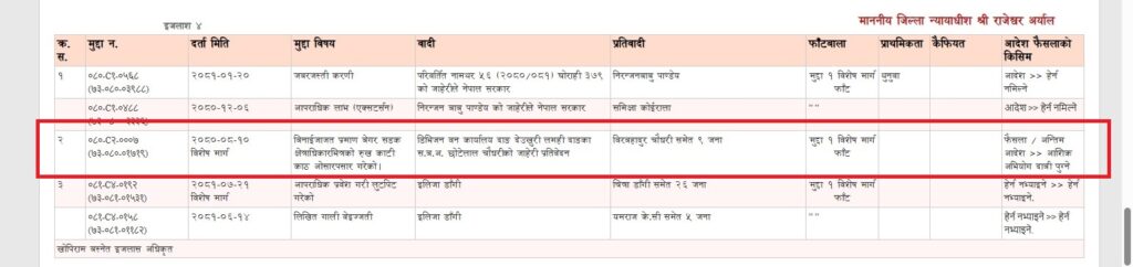 पुस २ गते जिल्ला न्यायाधीश राजेश्वर अर्यालको इजलासले राप्ती गाउँपालिकाका अध्यक्ष विष्ट, वडाध्यक्ष चौधरी समेत ९ जनाविरुद्ध ‘बिनाईजाजत प्रमाण बेगर सडक क्षेत्राधिकारभित्रको रुख काटी काठ ओसारपसार गरेको’ मुद्दामा फैसला सुनाएको हो ।