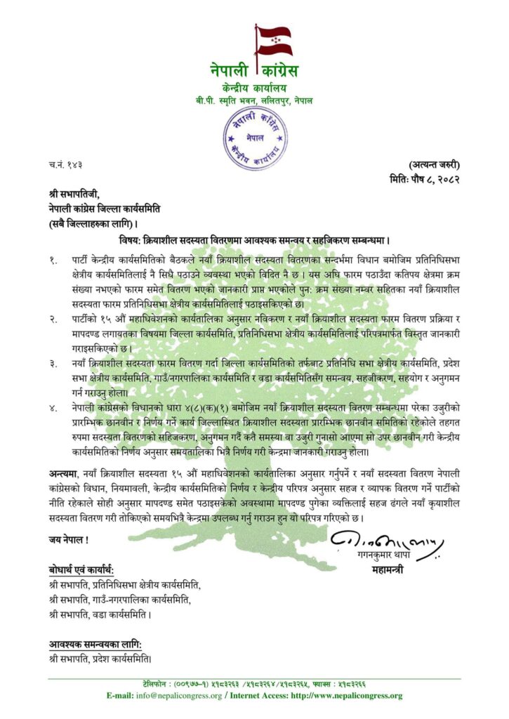 ‘पार्टीको १५औं महाधिवेशनको कार्यतालिका अनुसार नवीकरण र नयाँ क्रियाशील सदस्यता फार्म वितरण प्रक्रिया र मापदण्ड लगायतका विषयमा जिल्ला कार्यसमिति, प्रतिनिधिसभा क्षेत्रीय कार्यसमितिलाई परिपत्रमार्फत विस्तृत जानकारी गराइसकिएको छ,’ थापाले परिपत्रमा भनेका छन् ।