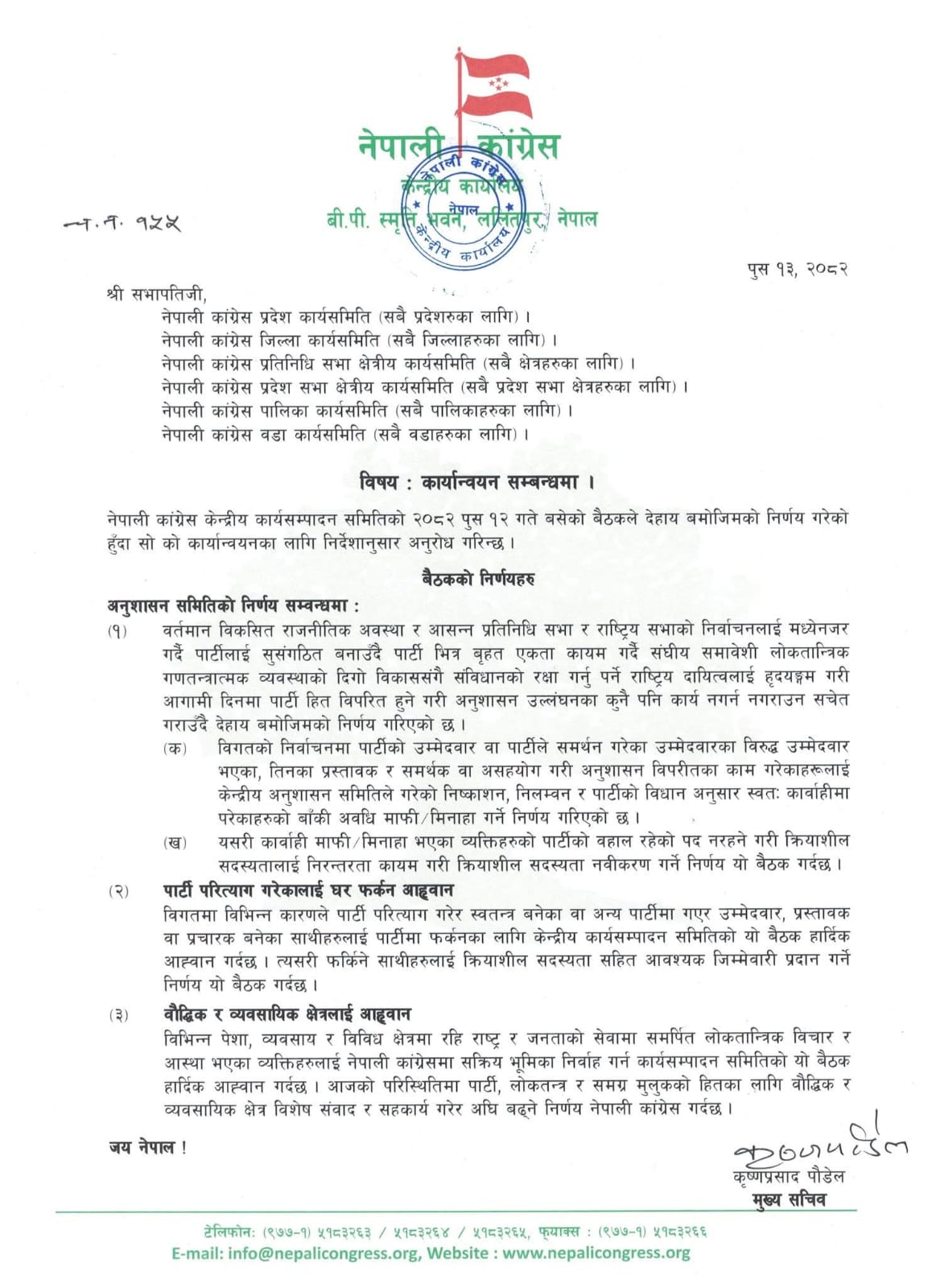 कांग्रेसले केन्द्रीय समितिबाट बुधबार गरेका निर्णयहरू