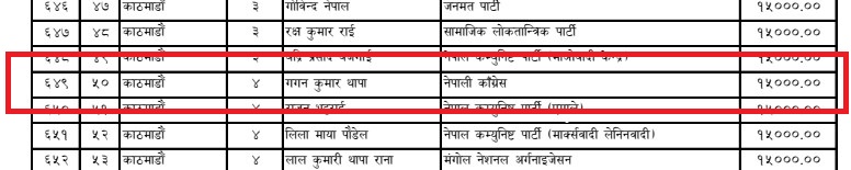 काठमाडौं । नेपाली कांग्रेसका महामन्त्री एवम् तत्कालीन समयमा काठमाडौं निर्वाचन क्षेत्र नं. ४ बाट विजयी भएका गगनकुमार थापालाई निर्वाचन आयोगले कालोसूचीमा राखेको छ ।