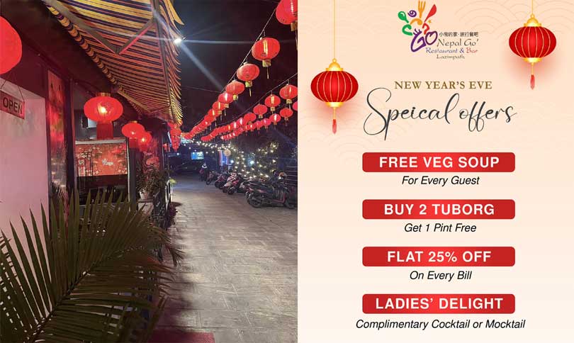 काठमाडौंको लाजिम्पाटस्थित जापनिज एम्बेसी नजिकै रहेको नेपाल गो चाईनिज रेष्टुरेन्टले अंग्रेजी नयाँ वर्षको अवसरमा बिलमा २५ प्रतिशतसम्म छुटको व्यवस्था गरेको सञ्चालक चन्द्र घर्ती मगरले बताए । उनले भने, ‘अंग्रेजी वर्षको अवसरमा खानेकुराहरूमा छुटको व्यवस्था गरेका छौं । महिला ग्राहकहरूका लागि ककटेल र मोक्टेल कम्लिमेन्ट्रीका रुपमा दिइनेछ ।’