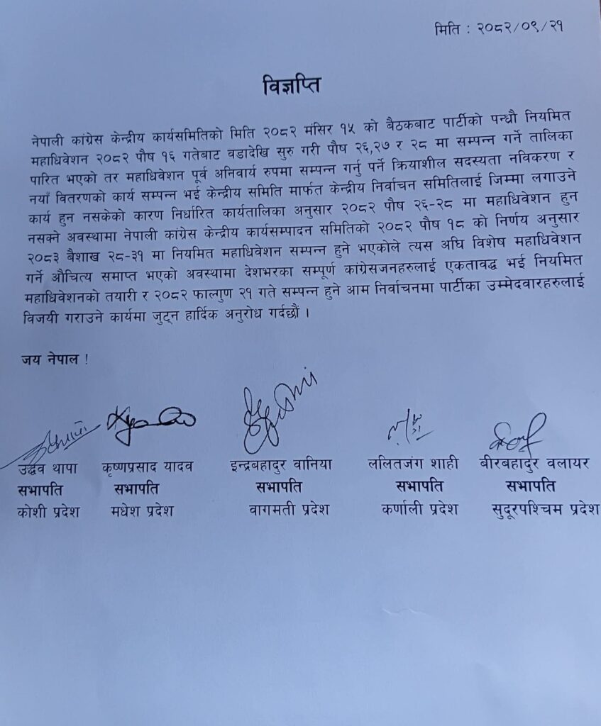 उनीहरूले विज्ञप्तिमा भनेका छन्, ‘नेपाली कांग्रेस केन्द्रीय कार्यसमितिको मिति २०८२ मङ्सिर १५ को बैठकबाट पार्टीको पन्ध्रौँ नियमित महाधिवेशन २०८२ पौष १६ गतेबाट वडादेखि सुरु गरी पौष २६, २७ र २८ मा सम्पन्न गर्ने तालिका पारित भएको तर, महाधिवेशन पूर्व अनिवार्य रूपमा सम्पन्न गर्नु पर्ने क्रियाशील सदस्यता नवीकरण र नयाँ वितरणको कार्य सम्पन्न भई केन्द्रीय समिति मार्फत केन्द्रीय निर्वाचन समितिलाई जिम्मा लगाउने कार्य हुन नसकेको कारण निर्धारित कार्यतालिका अनुसार २०८२ पौष २६– २८ मा महाधिवेशन हुन नसक्ने अवस्थामा नेपाली कांग्रेस केन्द्रीय कार्यसम्पादन समितिको २०८२ पौष १८ को निर्णय अनुसार २०८३ वैशाख २८–३१ मा नियमित महाधिवेशन सम्पन्न हुने भएकोले त्यस अघि विशेष महाधिवेशन गर्ने औचित्य समाप्त भएको अवस्थामा देशभरका सम्पूर्ण कांग्रेसजनहरूलाई एकताबद्ध भई नियमित महाधिवेशनको तयारी र २०८२ फाल्गुण २१ गते सम्पन्न हुने आम निर्वाचनमा पार्टीका उम्मेदवारहरूलाई विजयी गराउने कार्यमा जुट्न हार्दिक अनुरोध गर्दछौँ ।’