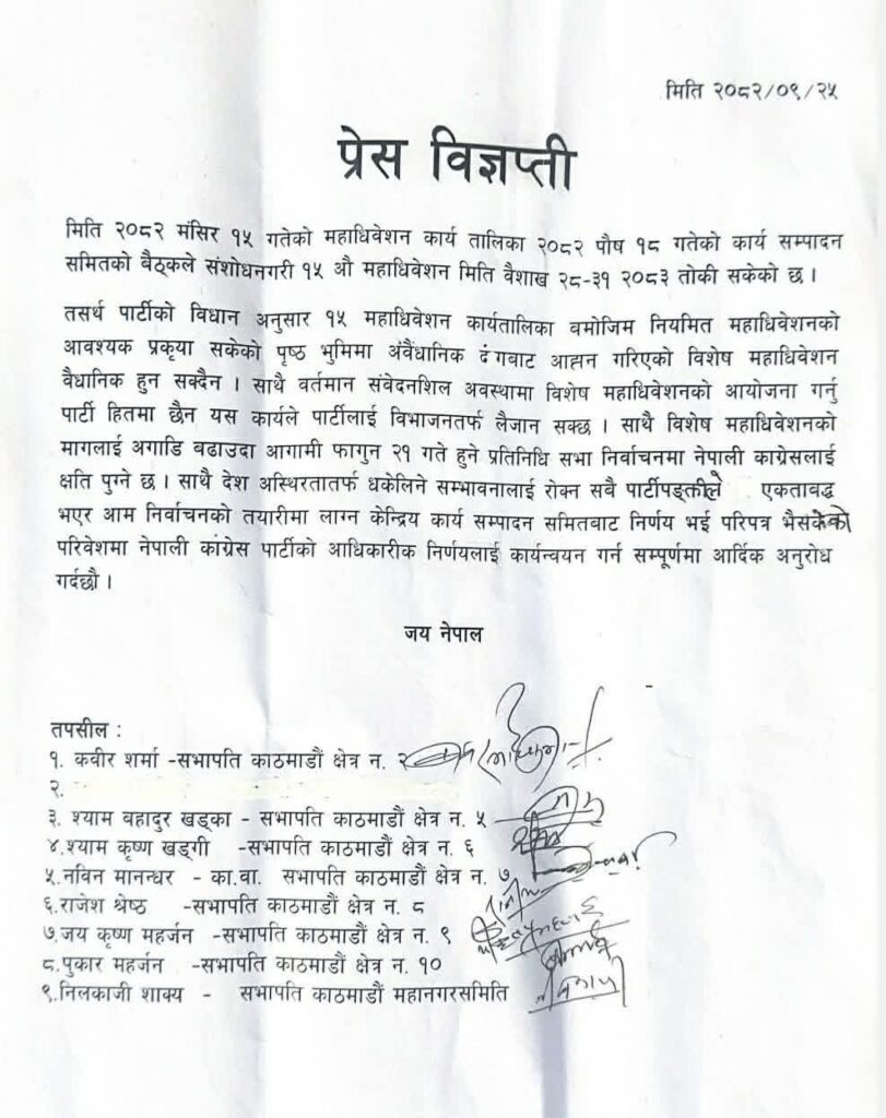 काठमाडौं । महामन्त्रीद्वय गगन थापा र विश्वप्रकाश शर्मा विशेष महाधिवेशनको नामबाट अबैधानिक भेला आह्वान गरेका बेला नेपाली कांग्रेस, काठमाडौंका ७ क्षेत्रीय सभापतिहरू नियमित महाधिवेशनको पक्षमा उभिएका छन् ।