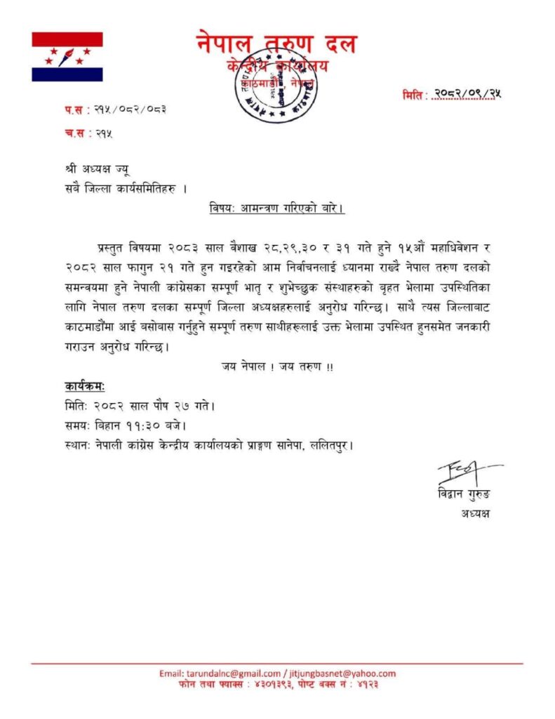 ‘प्रस्तुत विषयमा २०८३ साल वैशाख २८, २९, ३० र ३१ गते हुने १५औं महाधिवेशन र २०८२साल फागुन २१ गते हुन गइरहेको आम निर्वाचनलाई ध्यानमा राख्दै नेपाल तरुण दलको समन्वयमा हुने नेपाली कांग्रेसका सम्पूर्ण भ्रातृ र शुभेच्छुक संस्थाहरूको बृहत भेलामा उपस्थितिका लागि नेपाल तरुण दलका सम्पूर्ण जिल्ला अध्यक्षहरूलाई अनुरोध गरिन्छ । साथै त्यस जिल्लाबाट काठमाडौं आई बसोबास गर्नु हुने सम्पूण तरुण साथीहरूलाई उक्त भेलामा उपस्थित हुन समेत जानकारी गराउन अनुरोध गरिन्छ,’ अध्यक्ष गुरुङले भनेका छन् ।