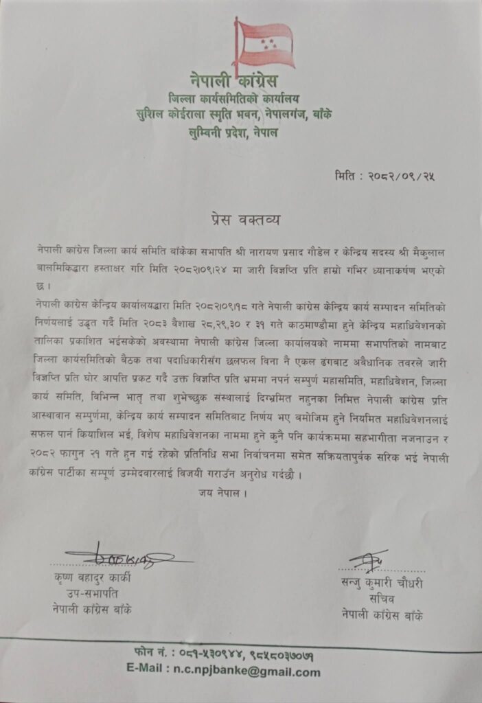 उनीहरूले भने, ‘नेपाली कांग्रेस जिल्ला कार्यसमिति बाँकेका सभापति श्री नारायणप्रसाद गौडेल र केन्द्रीय सदस्य श्री मैकुलाल बालमिकिद्वारा हस्ताक्षर गरि मिति २०८२७०९÷२४ मा जारी विज्ञप्तिप्रति हाम्रो गम्भीर ध्यानाकर्षण भएको छ ।’