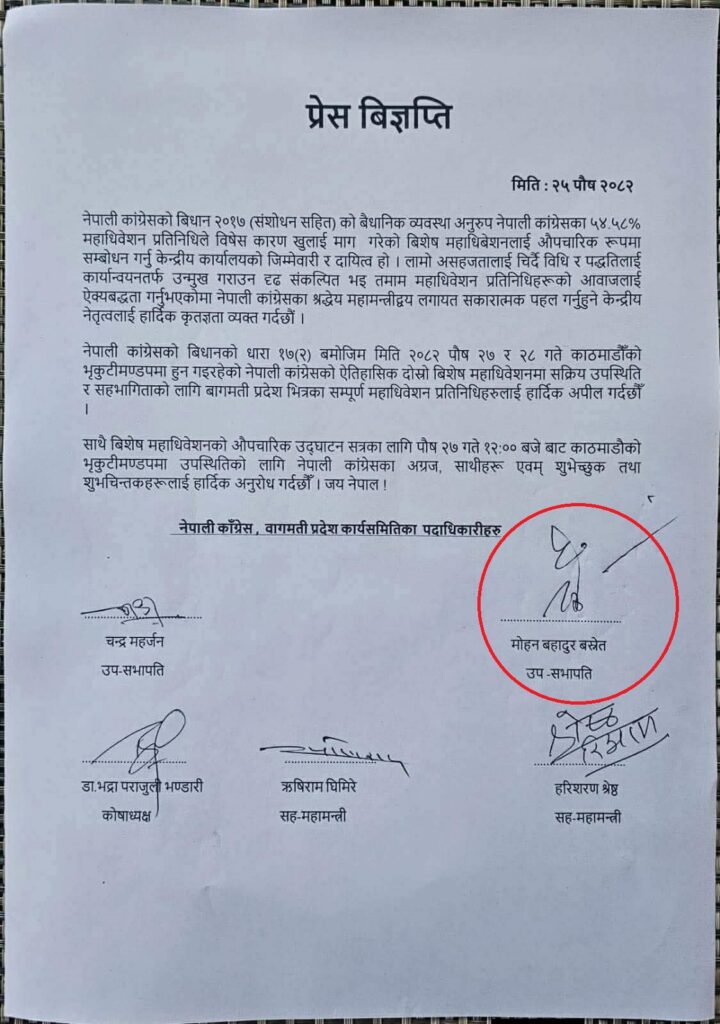 भ्रष्टाचारी ठहर भएका बागमती कांग्रेसका उपसभापति बस्नेतको अगुवाईमा उपसभापति चन्द्र महर्जन, कोषाध्यक्ष डा.भद्रा पराजुली भण्डारी, सहमहामन्त्री ऋषिराम घिमिरे र सहमहामन्त्री हरिशरण श्रेष्ठले शुक्रबार संयुक्त रुपमा विज्ञप्ति जारी गरेर महामन्त्रीद्वय थापा र शर्माको अबैधानिक विशेष महाधिवेशनमा सहभागी हुन अनुरोध गरेका छन् । बागमती कांग्रेसका अन्य पदाधिकारीहरूले बस्नेत जस्ता भ्रष्टाचारीसँग संयुक्त विज्ञप्ति जारी गर्न हिचकिचाहट गरेका छैनन् ।