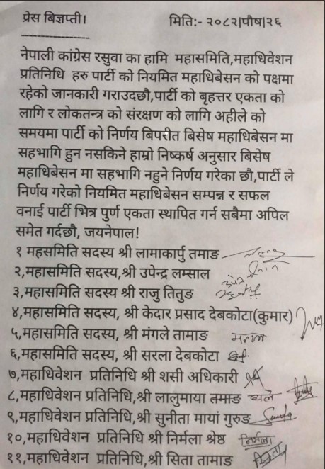 शनिबार ११ जना महाधिवेशन प्रतिनिधिहरूले संयुक्त रुपमा प्रेस विज्ञप्ति जारी गरेर आफूहरू महामन्त्रीद्वय थापा र शर्माको विशेष महाधिवेशनको पक्षमा नरहेको जनाएका छन् । उनीहरूले नियमित महाधिवेशन र फागुन २१ गतेको निर्वाचनमा केन्द्रित हुन अपील गरेका छन् ।