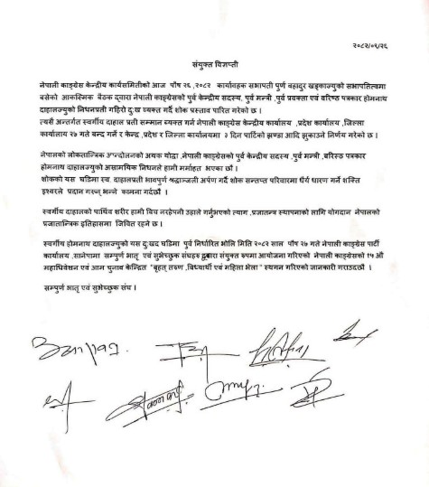 कांग्रेसका पूर्व केन्द्रीय सदस्य एवम् पूर्वमन्त्री होमनाथ दाहालको निधन भएका कारण केन्द्रीय कार्यालय, सानेपा बन्द हुने भएको हुँदा बृहत भेला स्थगित गरिएको संयुक्त प्रेस विज्ञप्तिमा उल्लेख छ । दाहालको निधनमा शोक मनाउन कांग्रेसले केन्द्रीय कार्यसमितिबाट निर्णय गरेर पार्टी कार्यालय बन्द राख्नेदेखि विभिन्न कार्यक्रमहरू गर्ने निर्णय गरेको छ ।