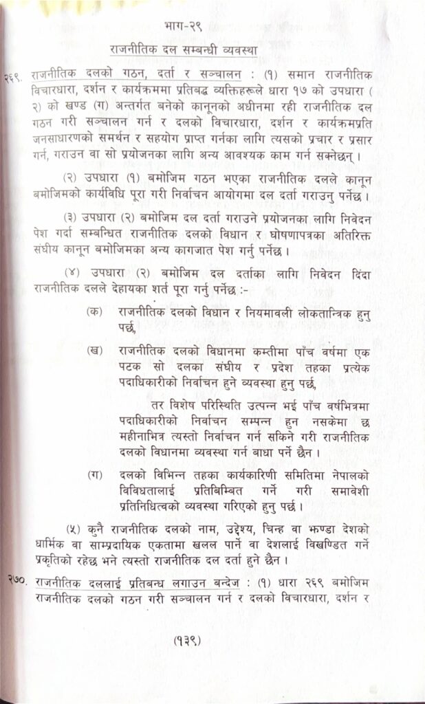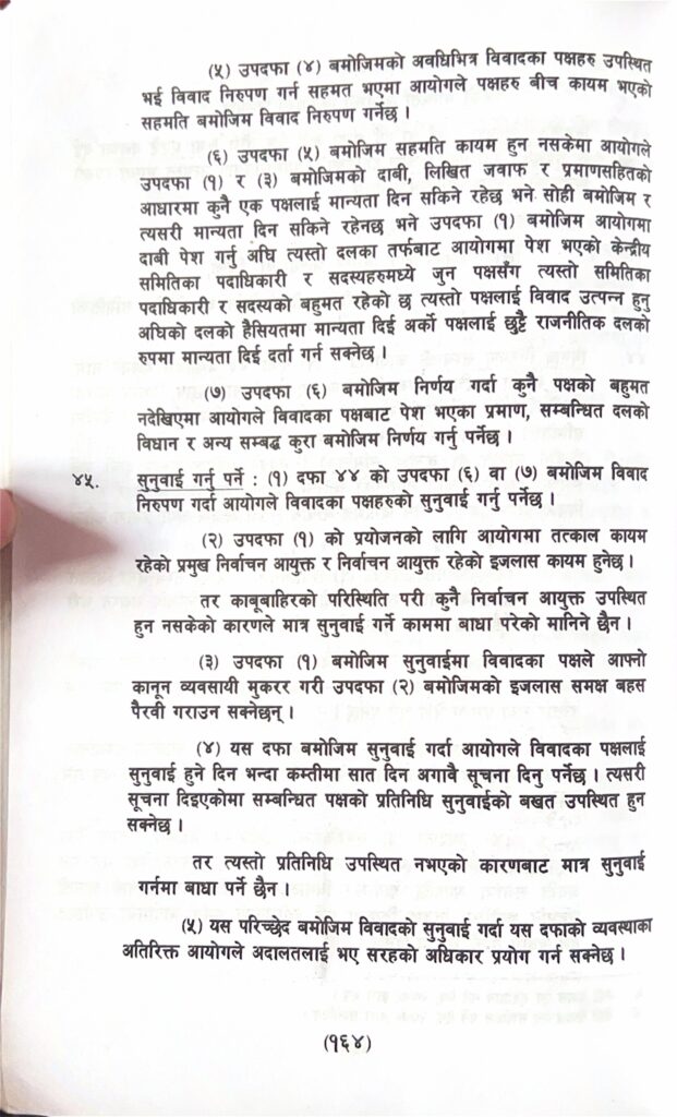 राजनीतिक दल सम्बन्धी ऐन २०७३ को दफा ४३ बमोजिम विवाद भएमा केन्द्रीय कार्यसमितिको पदाधिकारी र सदस्यहरूमध्ये जुन पक्षसँग त्यसको बहुमत छ सोही पक्षले दलवीच विवाद आउनुभन्दा अघिको दलको हैसियतले मान्यता प्राप्त गर्ने व्यवस्था दफा ४४ मा छ ।