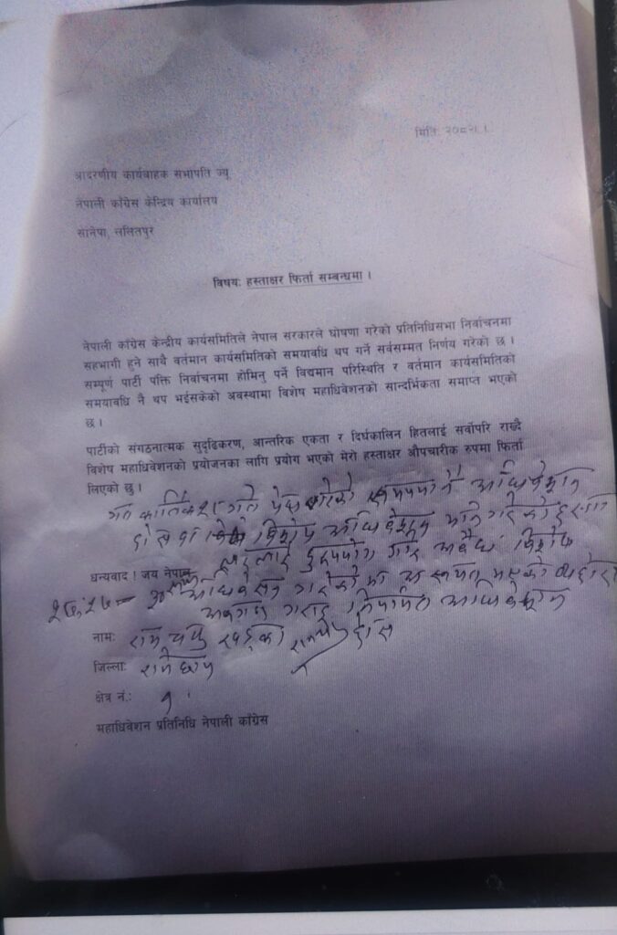यसैबीच, नेपाली कांग्रेस रामेछापका महाधिवेशन प्रतिनिधि रामबाबु खड्काले पनि आफ्नो हस्ताक्षर फिर्ता लिएका छन् । उनले पार्टी केन्द्रीय कार्यालय, सानेपामा निवेदन दिएर विशेष महाधिवेशनका लागि भनेर गरिएको हस्ताक्षर पार्टी विभाजनको लागि प्रयास भएकोमा असहमति राखेर हस्ताक्षर फिर्ता लिएको जनाएका छन् । खड्काले आफ्नो हस्ताक्षरलाई गगन–विश्व समूहले दुरुपयोग गरेको जनाएका छन् ।